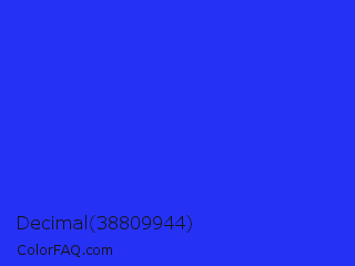 Decimal 38809944 Color is a normal blue color and the nearest color is Palatinate Blue #273be2. Hex code #2631f6 and RGB value is rgb(38,49,246). In RGB color space, this color is composed of 15% red, 19% green, 96% blue, In CMYK color space, this color is composed of 85% cyan, 80% magenta, 0% yellow , 4% black , In HSL color space, this color has a hue angle of 237° , 92% saturation and 56% lightness.