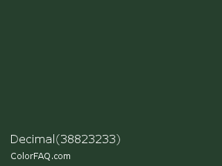 Decimal 38823233 Color is a very dark green color and the nearest color is Everglade #1c402e. Hex code #263f2d and RGB value is rgb(38,63,45). In RGB color space, this color is composed of 15% red, 25% green, 18% blue, In CMYK color space, this color is composed of 40% cyan, 0% magenta, 29% yellow , 75% black , In HSL color space, this color has a hue angle of 137° , 25% saturation and 20% lightness.