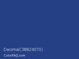 Decimal 38824070 Color is a normal blue color and the nearest color is Bay Of Many #273a81. Hex code #264086 and RGB value is rgb(38,64,134). In RGB color space, this color is composed of 15% red, 25% green, 53% blue, In CMYK color space, this color is composed of 72% cyan, 52% magenta, 0% yellow , 47% black , In HSL color space, this color has a hue angle of 224° , 56% saturation and 34% lightness.