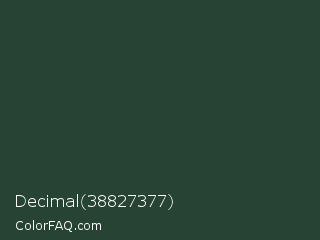 Decimal 38827377 Color is a very dark green color and the nearest color is Everglade #1c402e. Hex code #264333 and RGB value is rgb(38,67,51). In RGB color space, this color is composed of 15% red, 26% green, 20% blue, In CMYK color space, this color is composed of 43% cyan, 0% magenta, 24% yellow , 74% black , In HSL color space, this color has a hue angle of 147° , 28% saturation and 21% lightness.