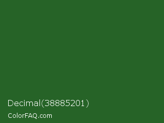 Decimal 38885201 Color is a dark green color and the nearest color is Mughal Green #306030. Hex code #266327 and RGB value is rgb(38,99,39). In RGB color space, this color is composed of 15% red, 39% green, 15% blue, In CMYK color space, this color is composed of 62% cyan, 0% magenta, 61% yellow , 61% black , In HSL color space, this color has a hue angle of 121° , 45% saturation and 27% lightness.