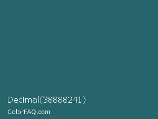 Decimal 38888241 Color is a dark cyan color and the nearest color is Casal #2f6168. Hex code #26656b and RGB value is rgb(38,101,107). In RGB color space, this color is composed of 15% red, 40% green, 42% blue, In CMYK color space, this color is composed of 64% cyan, 6% magenta, 0% yellow , 58% black , In HSL color space, this color has a hue angle of 185° , 48% saturation and 28% lightness.
