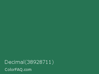 Decimal 38928711 Color is a dark green color and the nearest color is Dark Spring Green #177245. Hex code #267453 and RGB value is rgb(38,116,83). In RGB color space, this color is composed of 15% red, 45% green, 33% blue, In CMYK color space, this color is composed of 67% cyan, 0% magenta, 28% yellow , 55% black , In HSL color space, this color has a hue angle of 155° , 51% saturation and 30% lightness.