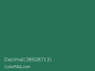Decimal 38928713 Color is a dark green color and the nearest color is Amazon #3b7a57. Hex code #267455 and RGB value is rgb(38,116,85). In RGB color space, this color is composed of 15% red, 45% green, 33% blue, In CMYK color space, this color is composed of 67% cyan, 0% magenta, 27% yellow , 55% black , In HSL color space, this color has a hue angle of 156° , 51% saturation and 30% lightness.