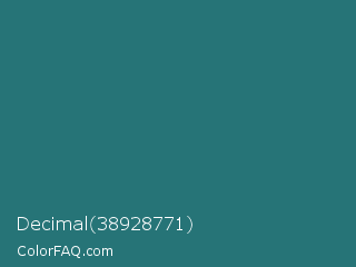 Decimal 38928771 Color is a normal cyan color and the nearest color is Myrtle Green #317873. Hex code #267477 and RGB value is rgb(38,116,119). In RGB color space, this color is composed of 15% red, 45% green, 47% blue, In CMYK color space, this color is composed of 68% cyan, 3% magenta, 0% yellow , 53% black , In HSL color space, this color has a hue angle of 182° , 52% saturation and 31% lightness.