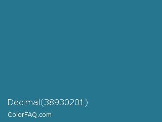 Decimal 38930201 Color is a normal blue color and the nearest color is Calypso #31728d. Hex code #26768f and RGB value is rgb(38,118,143). In RGB color space, this color is composed of 15% red, 46% green, 56% blue, In CMYK color space, this color is composed of 73% cyan, 17% magenta, 0% yellow , 44% black , In HSL color space, this color has a hue angle of 194° , 58% saturation and 35% lightness.