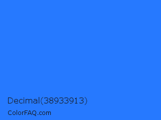 Decimal 38933913 Color is a normal blue color and the nearest color is Blue Crayola #1f75fe. Hex code #2679ff and RGB value is rgb(38,121,255). In RGB color space, this color is composed of 15% red, 47% green, 100% blue, In CMYK color space, this color is composed of 85% cyan, 53% magenta, 0% yellow , 0% black , In HSL color space, this color has a hue angle of 217° , 100% saturation and 57% lightness.