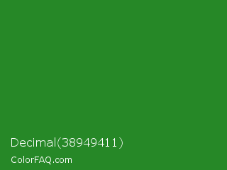 Decimal 38949411 Color is a normal green color and the nearest color is Forest Green #228b22. Hex code #268827 and RGB value is rgb(38,136,39). In RGB color space, this color is composed of 15% red, 53% green, 15% blue, In CMYK color space, this color is composed of 72% cyan, 0% magenta, 71% yellow , 47% black , In HSL color space, this color has a hue angle of 121° , 56% saturation and 34% lightness.