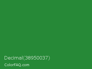 Decimal 38950037 Color is a normal green color and the nearest color is Forest Green #228b22. Hex code #268937 and RGB value is rgb(38,137,55). In RGB color space, this color is composed of 15% red, 54% green, 22% blue, In CMYK color space, this color is composed of 72% cyan, 0% magenta, 60% yellow , 46% black , In HSL color space, this color has a hue angle of 130° , 57% saturation and 34% lightness.