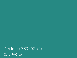 Decimal 38950257 Color is a normal cyan color and the nearest color is Lochinvar #2c8c84. Hex code #268983 and RGB value is rgb(38,137,131). In RGB color space, this color is composed of 15% red, 54% green, 51% blue, In CMYK color space, this color is composed of 72% cyan, 0% magenta, 4% yellow , 46% black , In HSL color space, this color has a hue angle of 176° , 57% saturation and 34% lightness.