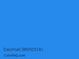 Decimal 38950518 Color is a normal blue color and the nearest color is Bleu De France #318ce7. Hex code #2689ec and RGB value is rgb(38,137,236). In RGB color space, this color is composed of 15% red, 54% green, 93% blue, In CMYK color space, this color is composed of 84% cyan, 42% magenta, 0% yellow , 7% black , In HSL color space, this color has a hue angle of 210° , 84% saturation and 54% lightness.