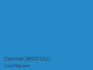 Decimal 38951062 Color is a normal blue color and the nearest color is Curious Blue #2596d1. Hex code #268ac8 and RGB value is rgb(38,138,200). In RGB color space, this color is composed of 15% red, 54% green, 78% blue, In CMYK color space, this color is composed of 81% cyan, 31% magenta, 0% yellow , 22% black , In HSL color space, this color has a hue angle of 203° , 68% saturation and 47% lightness.