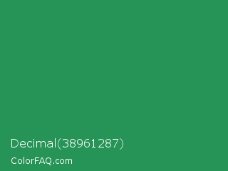 Decimal 38961287 Color is a normal green color and the nearest color is Eucalyptus #278a5b. Hex code #269357 and RGB value is rgb(38,147,87). In RGB color space, this color is composed of 15% red, 58% green, 34% blue, In CMYK color space, this color is composed of 74% cyan, 0% magenta, 41% yellow , 42% black , In HSL color space, this color has a hue angle of 147° , 59% saturation and 36% lightness.