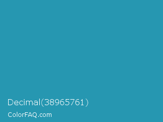 Decimal 38965761 Color is a normal cyan color and the nearest color is Eastern Blue #1e9ab0. Hex code #2697b1 and RGB value is rgb(38,151,177). In RGB color space, this color is composed of 15% red, 59% green, 69% blue, In CMYK color space, this color is composed of 79% cyan, 15% magenta, 0% yellow , 31% black , In HSL color space, this color has a hue angle of 191° , 65% saturation and 42% lightness.