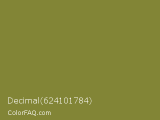 Decimal 624101784 Color is a normal yellow color and the nearest color is Old Moss Green #867e36. Hex code #828536 and RGB value is rgb(130,133,54). In RGB color space, this color is composed of 51% red, 52% green, 21% blue, In CMYK color space, this color is composed of 2% cyan, 0% magenta, 59% yellow , 48% black , In HSL color space, this color has a hue angle of 62° , 42% saturation and 37% lightness.