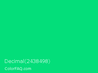 Decimal 2438498 Color is a normal green color and the nearest color is Spring Green #00ff7f. Hex code #03de7a and RGB value is rgb(3,222,122). In RGB color space, this color is composed of 1% red, 87% green, 48% blue, In CMYK color space, this color is composed of 99% cyan, 0% magenta, 45% yellow , 13% black , In HSL color space, this color has a hue angle of 153° , 97% saturation and 44% lightness.