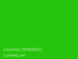 Decimal 39060820 Color is a normal green color and the nearest color is Harlequin Green #46cb18. Hex code #26c40a and RGB value is rgb(38,196,10). In RGB color space, this color is composed of 15% red, 77% green, 4% blue, In CMYK color space, this color is composed of 81% cyan, 0% magenta, 95% yellow , 23% black , In HSL color space, this color has a hue angle of 111° , 90% saturation and 40% lightness.