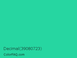 Decimal 39080723 Color is a normal green color and the nearest color is Shamrock #33cc99. Hex code #26d6a1 and RGB value is rgb(38,214,161). In RGB color space, this color is composed of 15% red, 84% green, 63% blue, In CMYK color space, this color is composed of 82% cyan, 0% magenta, 25% yellow , 16% black , In HSL color space, this color has a hue angle of 162° , 70% saturation and 49% lightness.
