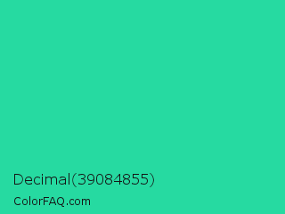 Decimal 39084855 Color is a normal green color and the nearest color is Shamrock #33cc99. Hex code #26daa1 and RGB value is rgb(38,218,161). In RGB color space, this color is composed of 15% red, 85% green, 63% blue, In CMYK color space, this color is composed of 83% cyan, 0% magenta, 26% yellow , 15% black , In HSL color space, this color has a hue angle of 161° , 71% saturation and 50% lightness.