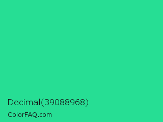 Decimal 39088968 Color is a normal green color and the nearest color is Shamrock #33cc99. Hex code #26de94 and RGB value is rgb(38,222,148). In RGB color space, this color is composed of 15% red, 87% green, 58% blue, In CMYK color space, this color is composed of 83% cyan, 0% magenta, 33% yellow , 13% black , In HSL color space, this color has a hue angle of 156° , 74% saturation and 51% lightness.