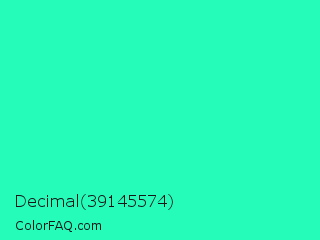 Decimal 39145574 Color is a normal green color and the nearest color is Turquoise PWG #30d5c8. Hex code #26fcba and RGB value is rgb(38,252,186). In RGB color space, this color is composed of 15% red, 99% green, 73% blue, In CMYK color space, this color is composed of 85% cyan, 0% magenta, 26% yellow , 1% black , In HSL color space, this color has a hue angle of 161° , 97% saturation and 57% lightness.