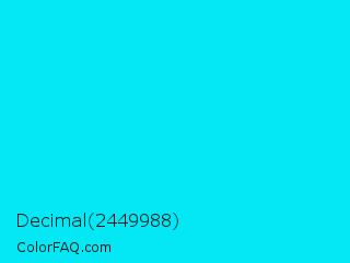 Decimal 2449988 Color is a normal cyan color and the nearest color is Loeen #15f2fd. Hex code #03e8f4 and RGB value is rgb(3,232,244). In RGB color space, this color is composed of 1% red, 91% green, 96% blue, In CMYK color space, this color is composed of 99% cyan, 5% magenta, 0% yellow , 4% black , In HSL color space, this color has a hue angle of 183° , 98% saturation and 48% lightness.