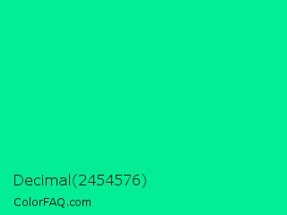 Decimal 2454576 Color is a normal green color and the nearest color is Medium Spring Green #00fa9a. Hex code #03ed96 and RGB value is rgb(3,237,150). In RGB color space, this color is composed of 1% red, 93% green, 59% blue, In CMYK color space, this color is composed of 99% cyan, 0% magenta, 37% yellow , 7% black , In HSL color space, this color has a hue angle of 158° , 98% saturation and 47% lightness.