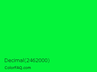 Decimal 2462000 Color is a normal green color and the nearest color is Malachite #0bda51. Hex code #03f43a and RGB value is rgb(3,244,58). In RGB color space, this color is composed of 1% red, 96% green, 23% blue, In CMYK color space, this color is composed of 99% cyan, 0% magenta, 76% yellow , 4% black , In HSL color space, this color has a hue angle of 134° , 98% saturation and 48% lightness.