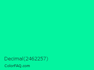Decimal 2462257 Color is a normal green color and the nearest color is Medium Spring Green #00fa9a. Hex code #03f49f and RGB value is rgb(3,244,159). In RGB color space, this color is composed of 1% red, 96% green, 62% blue, In CMYK color space, this color is composed of 99% cyan, 0% magenta, 35% yellow , 4% black , In HSL color space, this color has a hue angle of 159° , 98% saturation and 48% lightness.