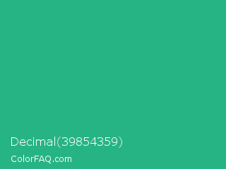 Decimal 39854359 Color is a normal green color and the nearest color is Jungle Green #29ab87. Hex code #27b485 and RGB value is rgb(39,180,133). In RGB color space, this color is composed of 15% red, 71% green, 52% blue, In CMYK color space, this color is composed of 78% cyan, 0% magenta, 26% yellow , 29% black , In HSL color space, this color has a hue angle of 160° , 64% saturation and 43% lightness.