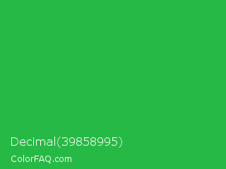 Decimal 39858995 Color is a normal green color and the nearest color is Wageningen Green #34b233. Hex code #27b945 and RGB value is rgb(39,185,69). In RGB color space, this color is composed of 15% red, 73% green, 27% blue, In CMYK color space, this color is composed of 79% cyan, 0% magenta, 63% yellow , 27% black , In HSL color space, this color has a hue angle of 132° , 65% saturation and 44% lightness.