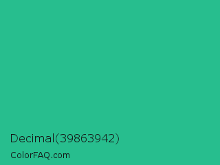 Decimal 39863942 Color is a normal green color and the nearest color is Mountain Meadow #30ba8f. Hex code #27be8e and RGB value is rgb(39,190,142). In RGB color space, this color is composed of 15% red, 75% green, 56% blue, In CMYK color space, this color is composed of 79% cyan, 0% magenta, 25% yellow , 25% black , In HSL color space, this color has a hue angle of 161° , 66% saturation and 45% lightness.