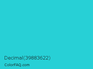 Decimal 39883622 Color is a normal cyan color and the nearest color is Turquoise PWG #30d5c8. Hex code #27d0d6 and RGB value is rgb(39,208,214). In RGB color space, this color is composed of 15% red, 82% green, 84% blue, In CMYK color space, this color is composed of 82% cyan, 3% magenta, 0% yellow , 16% black , In HSL color space, this color has a hue angle of 182° , 69% saturation and 50% lightness.