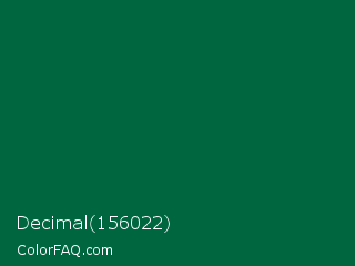 Decimal 156022 Color is a very dark green color and the nearest color is Cadmium Green #006b3c. Hex code #006640 and RGB value is rgb(0,102,64). In RGB color space, this color is composed of 0% red, 40% green, 25% blue, In CMYK color space, this color is composed of 100% cyan, 0% magenta, 37% yellow , 60% black , In HSL color space, this color has a hue angle of 158° , 100% saturation and 20% lightness.