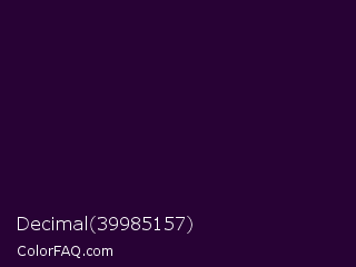 Decimal 39985157 Color is a very dark purple color and the nearest color is Mardi Gras #350036. Hex code #280235 and RGB value is rgb(40,2,53). In RGB color space, this color is composed of 16% red, 1% green, 21% blue, In CMYK color space, this color is composed of 25% cyan, 96% magenta, 0% yellow , 79% black , In HSL color space, this color has a hue angle of 285° , 93% saturation and 11% lightness.