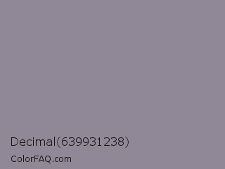 Decimal 639931238 Color is a normal purple color and the nearest color is Venus #928590. Hex code #908896 and RGB value is rgb(144,136,150). In RGB color space, this color is composed of 56% red, 53% green, 59% blue, In CMYK color space, this color is composed of 4% cyan, 9% magenta, 0% yellow , 41% black , In HSL color space, this color has a hue angle of 274° , 6% saturation and 56% lightness.