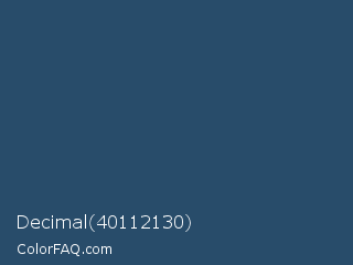 Decimal 40112130 Color is a dark blue color and the nearest color is San Juan #304b6a. Hex code #284c6a and RGB value is rgb(40,76,106). In RGB color space, this color is composed of 16% red, 30% green, 42% blue, In CMYK color space, this color is composed of 62% cyan, 28% magenta, 0% yellow , 58% black , In HSL color space, this color has a hue angle of 207° , 45% saturation and 29% lightness.