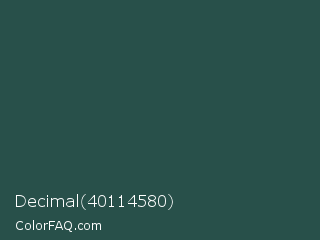Decimal 40114580 Color is a dark cyan color and the nearest color is Plantation #27504b. Hex code #28504a and RGB value is rgb(40,80,74). In RGB color space, this color is composed of 16% red, 31% green, 29% blue, In CMYK color space, this color is composed of 50% cyan, 0% magenta, 8% yellow , 69% black , In HSL color space, this color has a hue angle of 171° , 33% saturation and 24% lightness.