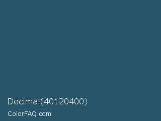 Decimal 40120400 Color is a dark blue color and the nearest color is San Juan #304b6a. Hex code #28546a and RGB value is rgb(40,84,106). In RGB color space, this color is composed of 16% red, 33% green, 42% blue, In CMYK color space, this color is composed of 62% cyan, 21% magenta, 0% yellow , 58% black , In HSL color space, this color has a hue angle of 200° , 45% saturation and 29% lightness.