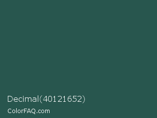 Decimal 40121652 Color is a dark cyan color and the nearest color is Plantation #27504b. Hex code #28564e and RGB value is rgb(40,86,78). In RGB color space, this color is composed of 16% red, 34% green, 31% blue, In CMYK color space, this color is composed of 53% cyan, 0% magenta, 9% yellow , 66% black , In HSL color space, this color has a hue angle of 170° , 37% saturation and 25% lightness.