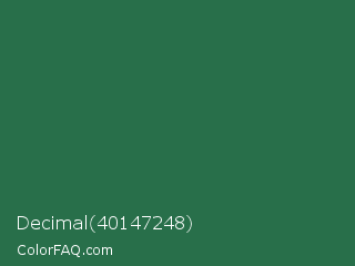 Decimal 40147248 Color is a dark green color and the nearest color is Dark Spring Green #177245. Hex code #286f4a and RGB value is rgb(40,111,74). In RGB color space, this color is composed of 16% red, 44% green, 29% blue, In CMYK color space, this color is composed of 64% cyan, 0% magenta, 33% yellow , 56% black , In HSL color space, this color has a hue angle of 149° , 47% saturation and 30% lightness.