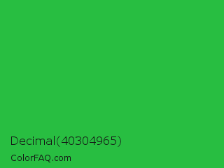 Decimal 40304965 Color is a normal green color and the nearest color is Wageningen Green #34b233. Hex code #28be41 and RGB value is rgb(40,190,65). In RGB color space, this color is composed of 16% red, 75% green, 25% blue, In CMYK color space, this color is composed of 79% cyan, 0% magenta, 66% yellow , 25% black , In HSL color space, this color has a hue angle of 130° , 65% saturation and 45% lightness.