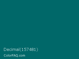 Decimal 157481 Color is a very dark cyan color and the nearest color is Mosque #036a6e. Hex code #006869 and RGB value is rgb(0,104,105). In RGB color space, this color is composed of 0% red, 41% green, 41% blue, In CMYK color space, this color is composed of 100% cyan, 1% magenta, 0% yellow , 59% black , In HSL color space, this color has a hue angle of 181° , 100% saturation and 21% lightness.