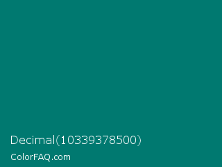 Decimal 10339378500 Color is a dark cyan color and the nearest color is Pine Green #01796f. Hex code #007970 and RGB value is rgb(0,121,112). In RGB color space, this color is composed of 0% red, 47% green, 44% blue, In CMYK color space, this color is composed of 100% cyan, 0% magenta, 7% yellow , 53% black , In HSL color space, this color has a hue angle of 176° , 100% saturation and 24% lightness.