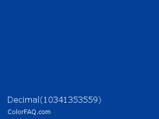 Decimal 10341353559 Color is a normal blue color and the nearest color is Congress Blue #02478e. Hex code #034199 and RGB value is rgb(3,65,153). In RGB color space, this color is composed of 1% red, 25% green, 60% blue, In CMYK color space, this color is composed of 98% cyan, 58% magenta, 0% yellow , 40% black , In HSL color space, this color has a hue angle of 215° , 96% saturation and 31% lightness.