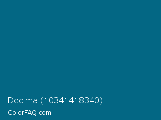 Decimal 10341418340 Color is a dark cyan color and the nearest color is Orient #015e85. Hex code #036784 and RGB value is rgb(3,103,132). In RGB color space, this color is composed of 1% red, 40% green, 52% blue, In CMYK color space, this color is composed of 98% cyan, 22% magenta, 0% yellow , 48% black , In HSL color space, this color has a hue angle of 193° , 96% saturation and 26% lightness.