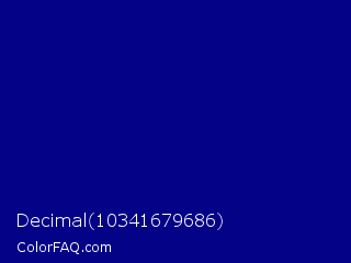 Decimal 10341679686 Color is a dark indigo color and the nearest color is Dark Blue #00008b. Hex code #040286 and RGB value is rgb(4,2,134). In RGB color space, this color is composed of 2% red, 1% green, 53% blue, In CMYK color space, this color is composed of 97% cyan, 99% magenta, 0% yellow , 47% black , In HSL color space, this color has a hue angle of 241° , 97% saturation and 27% lightness.