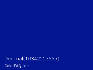 Decimal 10342117665 Color is a dark blue color and the nearest color is Phthalo Blue #000f89. Hex code #041591 and RGB value is rgb(4,21,145). In RGB color space, this color is composed of 2% red, 8% green, 57% blue, In CMYK color space, this color is composed of 97% cyan, 86% magenta, 0% yellow , 43% black , In HSL color space, this color has a hue angle of 233° , 95% saturation and 29% lightness.