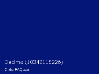 Decimal 10342118226 Color is a dark blue color and the nearest color is Dark Imperial Blue #00147e. Hex code #041678 and RGB value is rgb(4,22,120). In RGB color space, this color is composed of 2% red, 9% green, 47% blue, In CMYK color space, this color is composed of 97% cyan, 82% magenta, 0% yellow , 53% black , In HSL color space, this color has a hue angle of 231° , 94% saturation and 24% lightness.