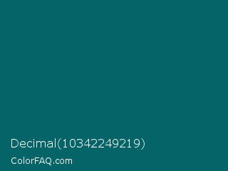 Decimal 10342249219 Color is a very dark cyan color and the nearest color is Blue Stone #016162. Hex code #046467 and RGB value is rgb(4,100,103). In RGB color space, this color is composed of 2% red, 39% green, 40% blue, In CMYK color space, this color is composed of 96% cyan, 3% magenta, 0% yellow , 60% black , In HSL color space, this color has a hue angle of 182° , 93% saturation and 21% lightness.